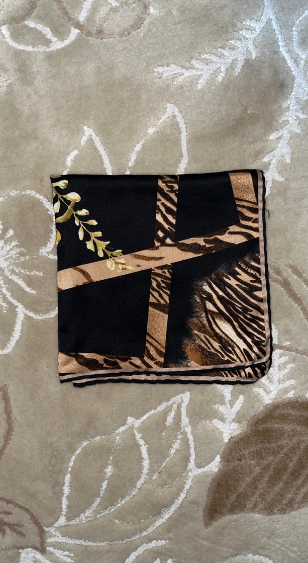 Sentetik kumaştan, kahverengi tonlarında bohem desenli ve tokalı kadın başörtü, Paris tarzı esintili. Etiketsiz ve kullanılmamıştır