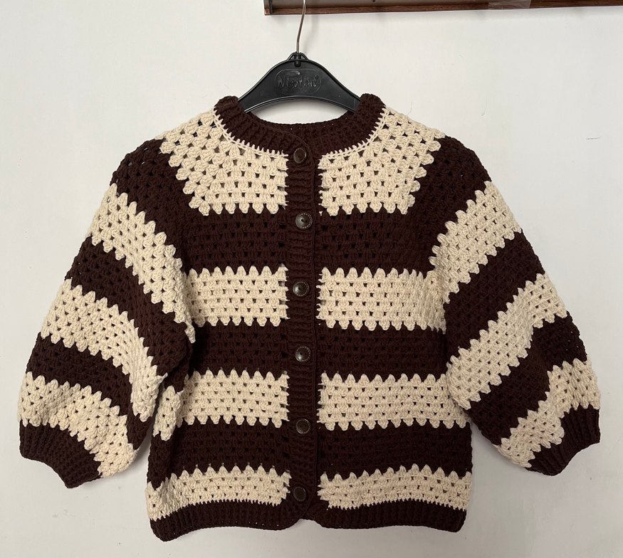 Koyu kahverengi örgüden, uzun kollu, bol kesim ve bohem tarzda çocuk hırkası. Yumuşak örgü kumaştan, çizgili sade desenli.