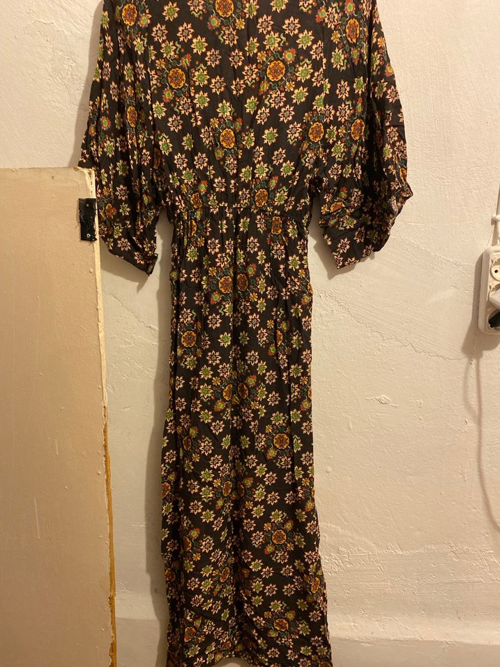 Kahverengi bohem uzun elbise, bol kesim, drapeli kısa kollu ve V yakalıdır. Koyu çiçek desenli, yumuşak kumaştan günlük kullanım için uygundur.