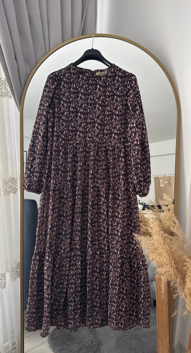 Kahverengi, uzun ve bol kesim kadın elbise, yumuşak sentetik kumaştan yapılmıştır ve rahat kürk detayına sahiptir. Koyu batik desenli ve yuvarlak yakalı, bohem tarz için uygundur.