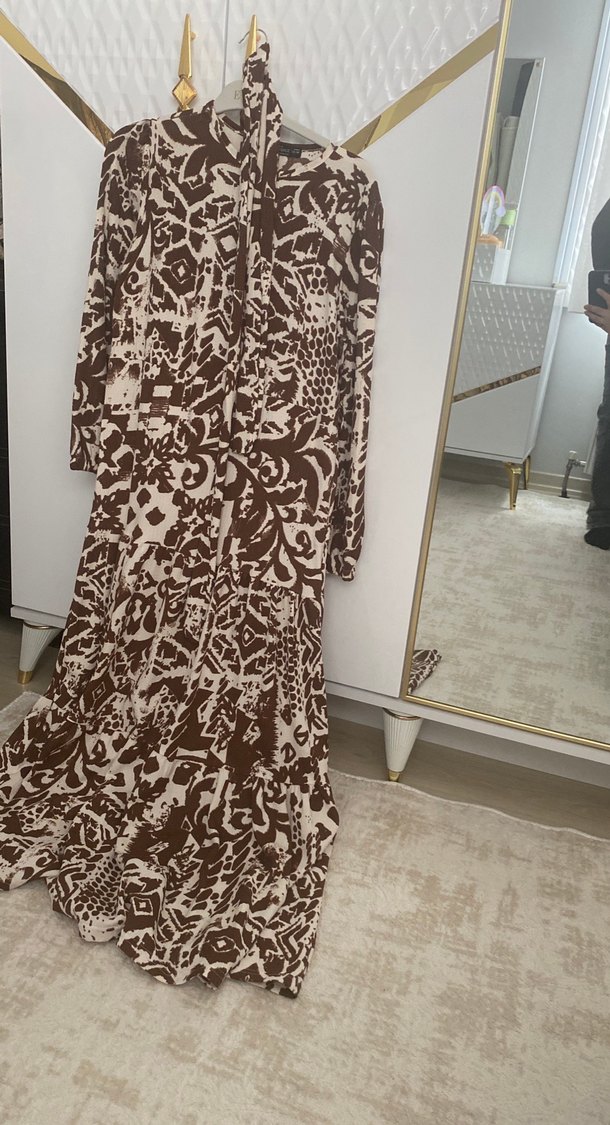 Kahverengi, soyut desenli uzun kollu, salaş kesim, tekne yaka ve drapeli bohem tarz elbise.