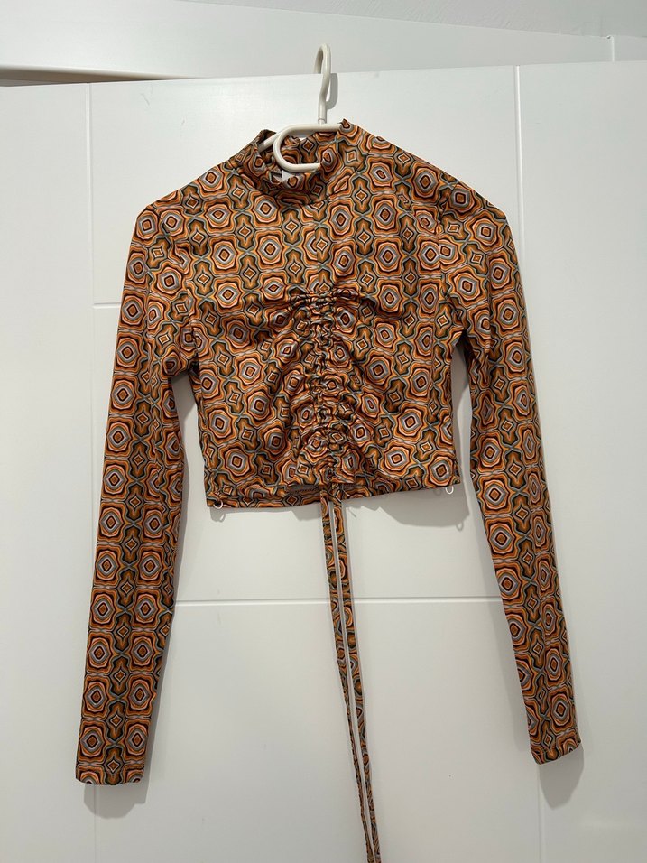 Koyu kahverengi tie-dye desenli, yüksek yakalı ve uzun kollu, sentetik kumaştan yapılmış, drapeli, dar kesim mini bluz. Bohem sokak tarzına uygun.