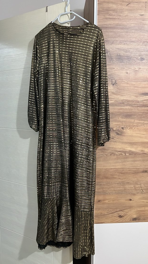 Kahverengi uzun elbise, kayık yaka ve bol kesimle drapeli detaylara sahiptir. Yumuşak sentetik kumaştan yapılmış, desenli ve parti için uygundur. ✨