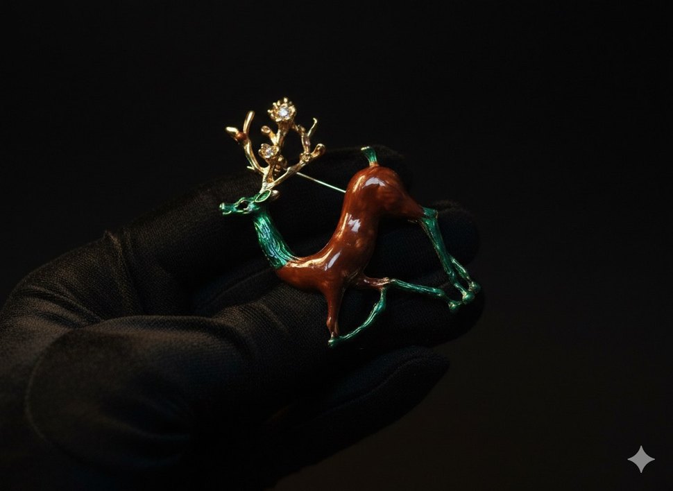 Kahverengi, işlemeli detaylara sahip toka şeklinde geyik broş, vintage ve bohem tarzları bir araya getirir. SIFIR ÜRÜN
