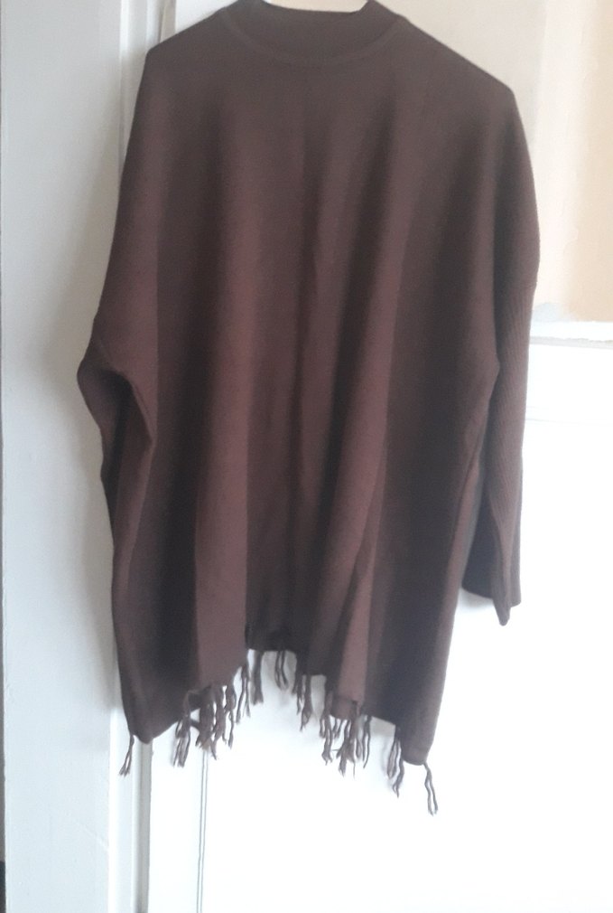 Kahverengi yün kadin kazak, yüksek yakalı ve bol kesimdir. Uzun kollu, püsküllü etek ucu detaylarıyla bohem ve rahat bir tarza sahiptir.