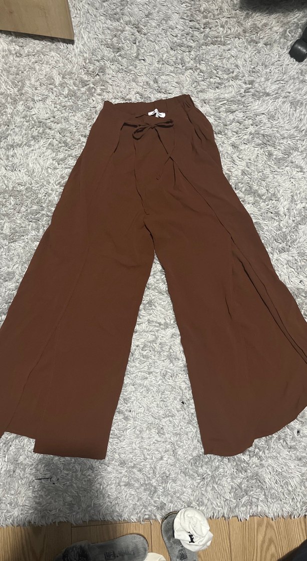 Yanları yırtmaçlı Uzun kahverengi kumaş pantolon, bol kesim ve kemer detayına sahiptir. Rahat ve şık sokak tarzı için uygundur. Günlük kullanıma idealdir.