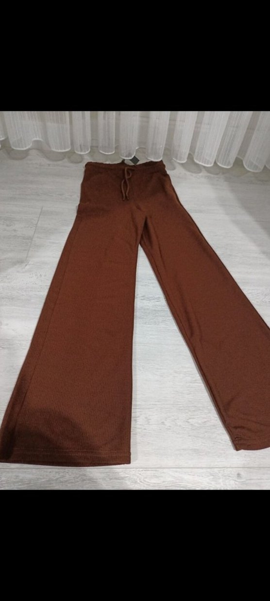 Kahverengi, kemerli, bol kesim midi pantolon. Yumuşak sentetik kumaştan, rahat ve sokak stili için uygun.