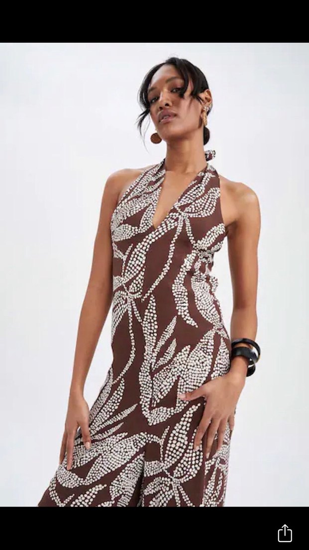 Kahverengi, ve V yakalı, yumuşak pamuklu kumaştan yapılmış, bohem tarzda uzun ve dar kesim tulum. ✨