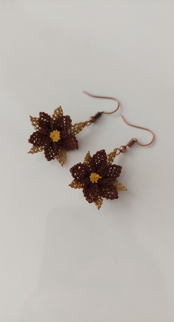Kahverengi Boncuk İşlemeli Çiçek Küpeler