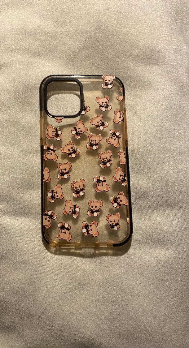 Koyu kahverengi renkte, boncuklu detaylara ve ayıcık desenine sahip, streetwear tarzında telefon kılıfı. İPhone