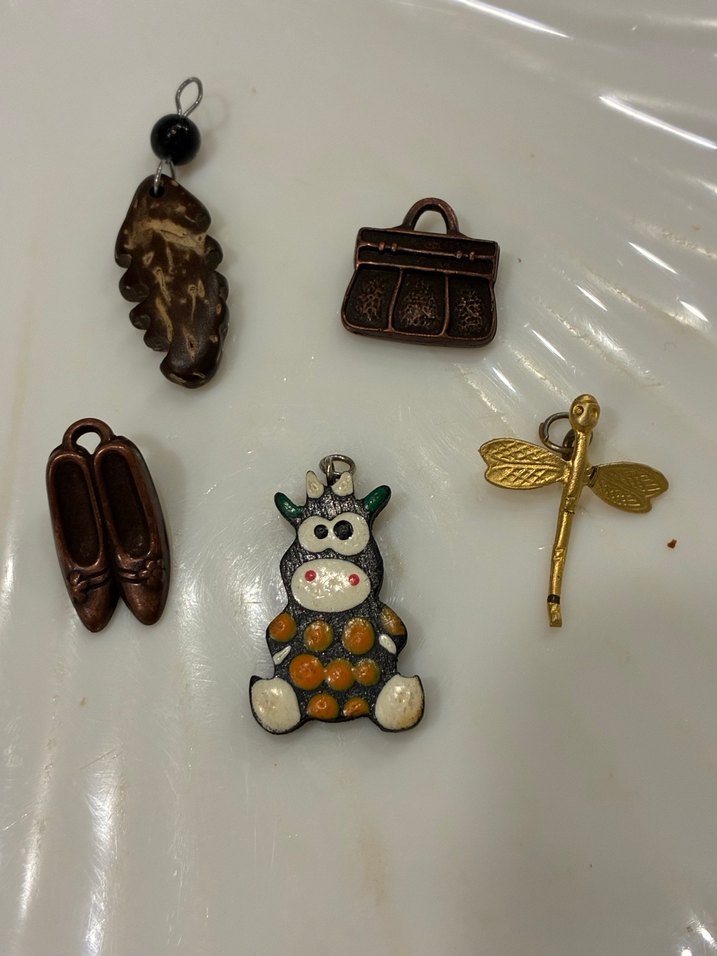 Kahverengi tonlarda boncuklu ve etnik desenli beş parçadan oluşan bohem tarzda kadın charm seti. Yaprak, çanta, ayakkabı, inek ve yusufçuk figürleri içerir.