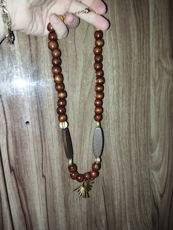 kahverengi boncuklardan oluşan, küçük dekoratif bir süsü olan bohem tarzda kolye. Günlük kullanıma uygundur.