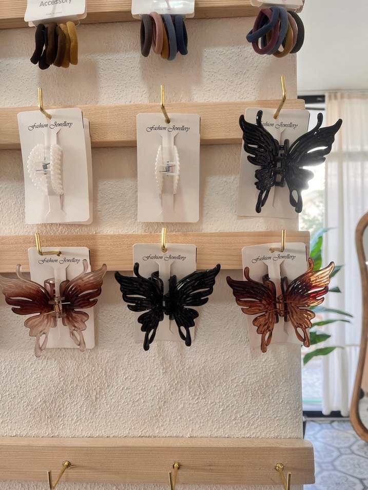 Kahverengi, plastikten yapılmış boncuk detaylı kelebek şeklinde saç tokası, moda ve minimalist tarz için uygun.