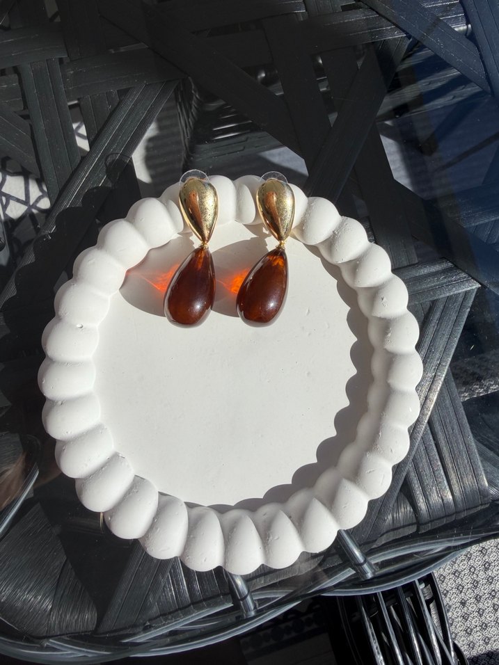 Kahverengi damla ve altın tonlu üst kısmı ile kısa, boncuklu küpeler bohem stil ve klasik zarafeti romantik akşamlar için birleştirir.