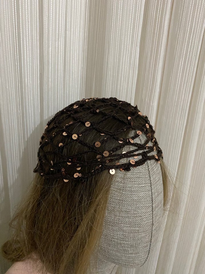 Koyu kahverengi örgüden yapılmış, boncuk detaylı saç aksesuarı. Bohem ve retro tarzları yansıtır.