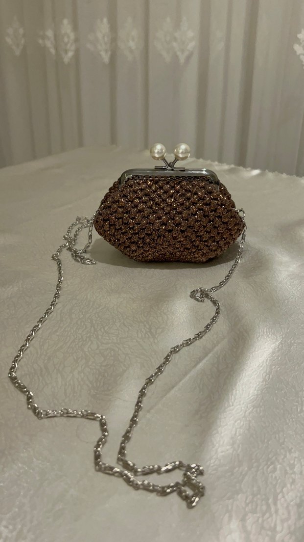 Kahverengi örme kumaştan, parlak boncuk detaylı ve yılan deseni bulunan vintage stil kadın portföy çanta, gümüş zincirli.