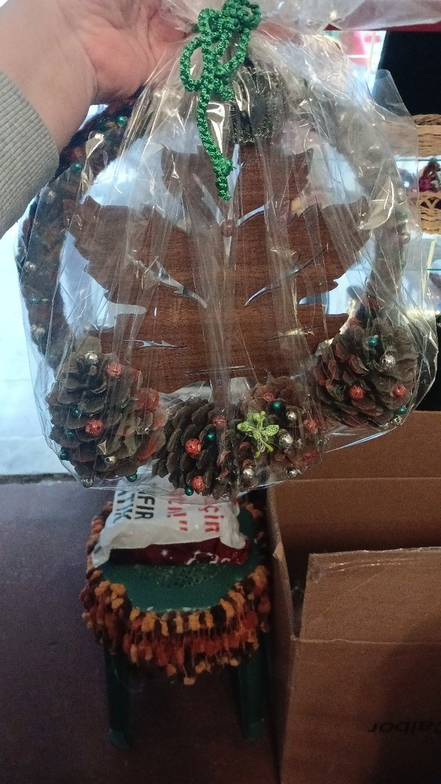 Küçük renkli boncuklarla süslenmiş kahverengi çam kozalaklarından oluşan dekoratif parça, şeffaf ambalajda. Ev dekorasyonuna doğal bir dokunuş katar.