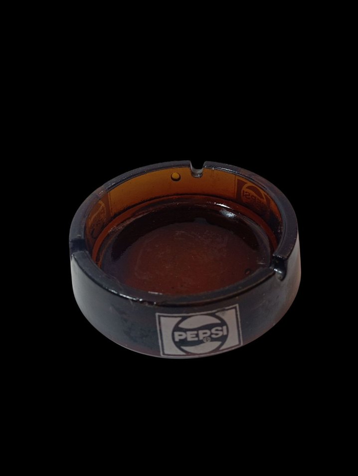 Pepsi logosu bulunan koyu kahverengi cam küllük. Yuvarlak ve sigara koymak için yarıkları var.