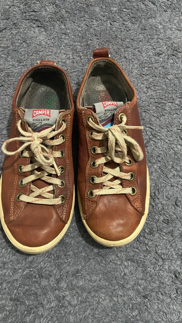 Bej bağcıklı kahverengi Camper erkek günlük ayakkabılar, gri tabanlı. Ayakkabılar dilinde Camper logosu bulunur.
