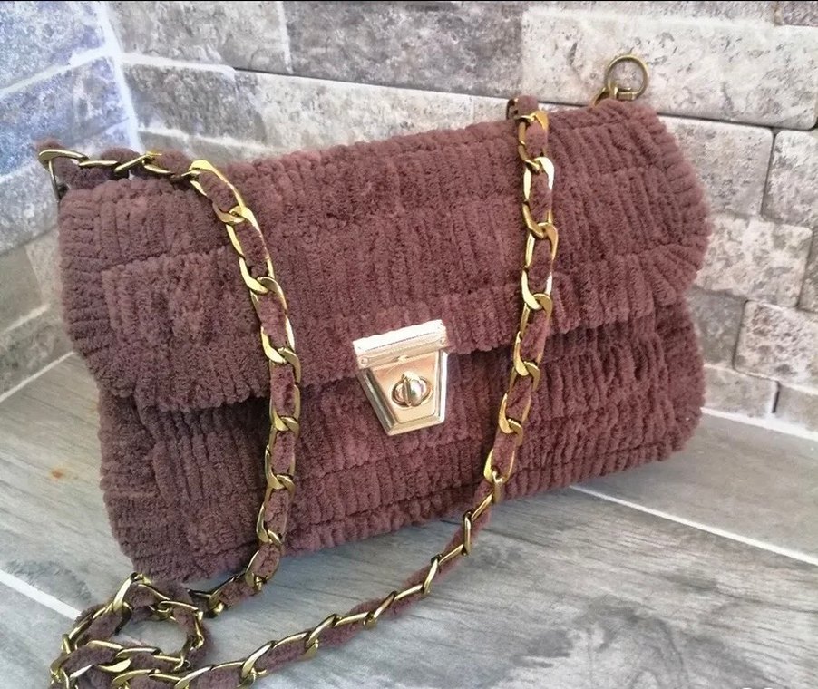 Kahverengi el emeği yapılmış, zincir detaylı kadın çantası. Rahat bohem tarzıyla günlük kullanıma uygundur.