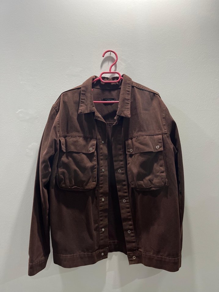 Kahverengi süet kumaştan, loose fit ve düğmeli, notched lapel yakalı kadın ceket. Uzun kollu ve midi boy, minimalist sokak stili için uygun.
