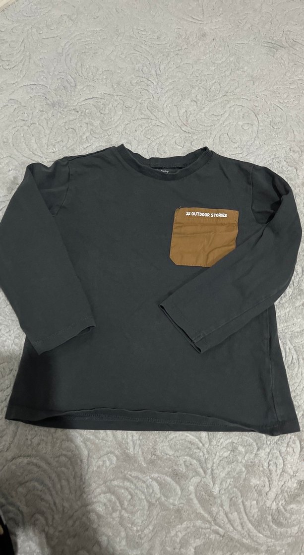Kahverengi cep detaylı, uzun kollu, yuvarlak yaka ve bol kesim erkek çocuk