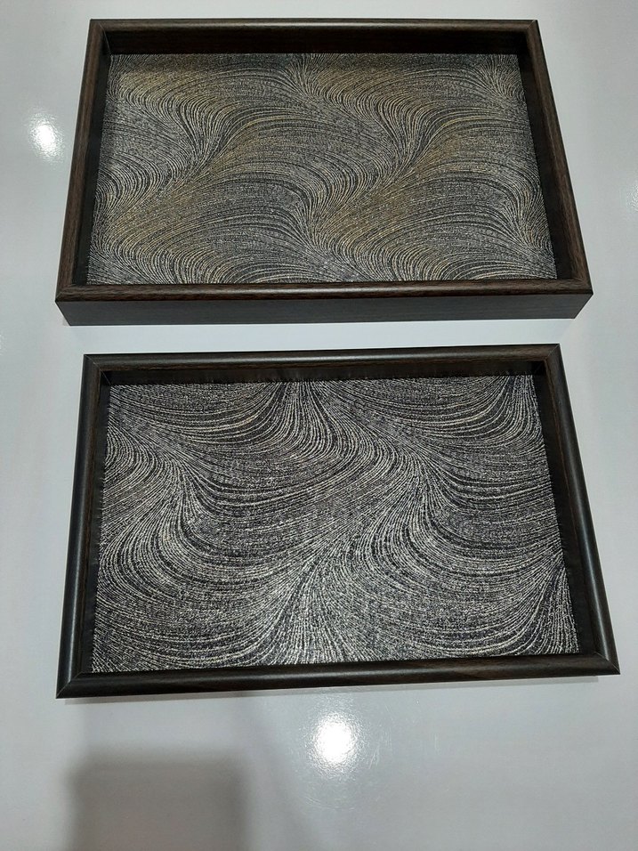 Kahverengi çerçeveli, gri dalgalı desenli iki adet tepsi seti.