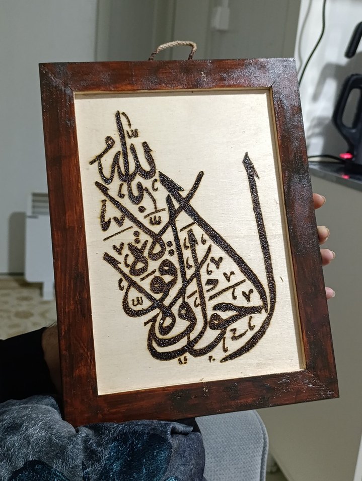 Açık zemin üzerinde koyu kahverengi Arapça hat sanatı bulunan, ip askılı ahşap çerçeveli tablo. ADET FİYATI