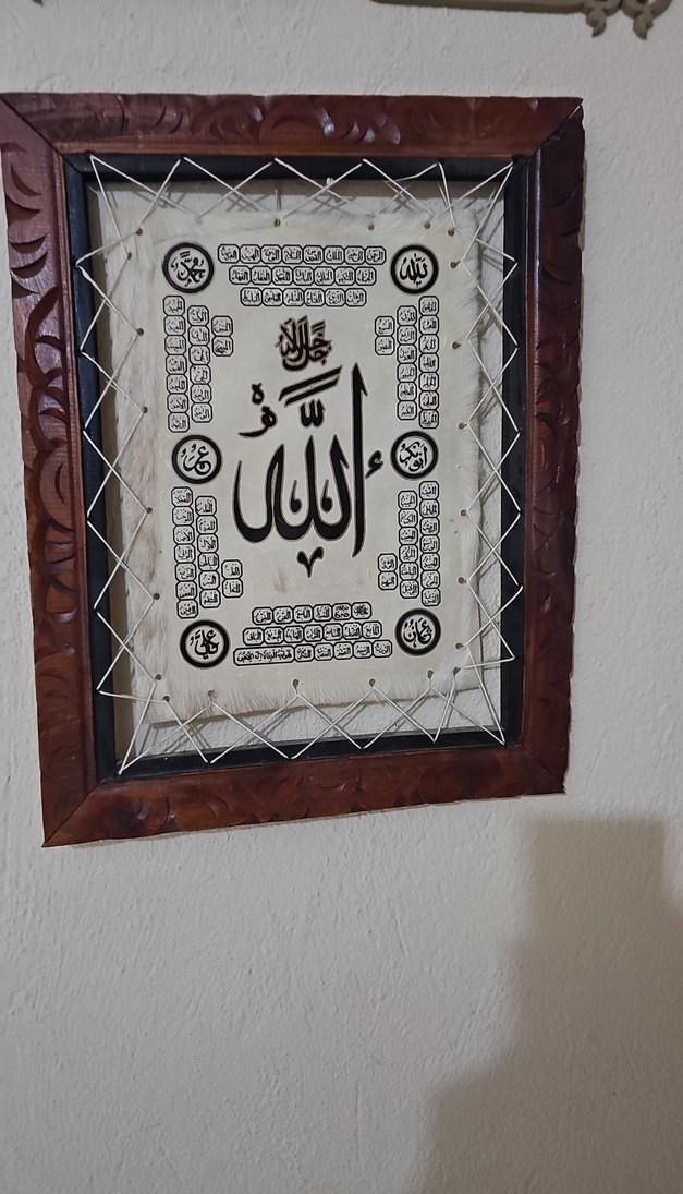 Koyu kahverengi çerçevesiyle, ortasında 'Allah' yazılı İslami hat sanatı içeren dekoratif tablo. Duvara asılmaya uygun. ️
