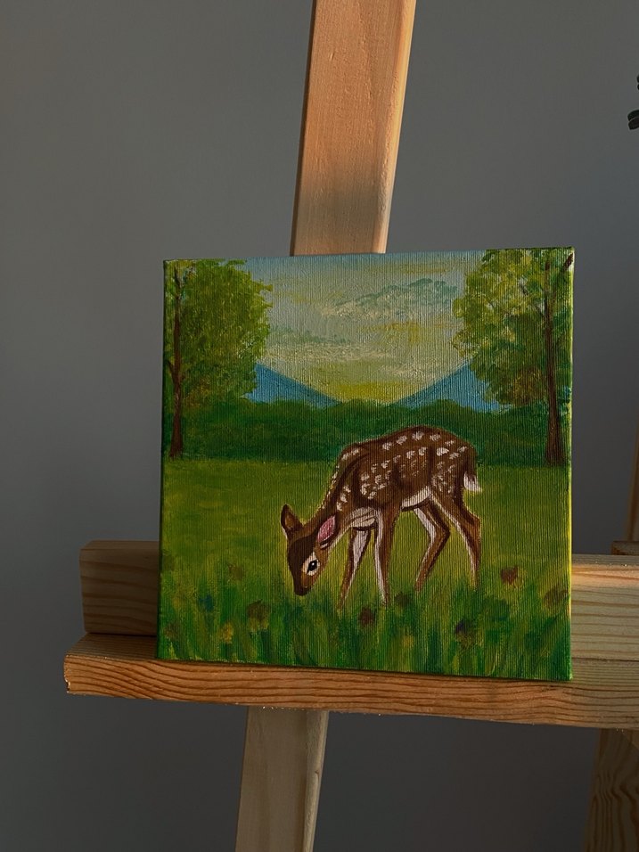 Bu boya tablo, yeşil bir alanda otlayan kahverengi bir ceylanı, arka planda ağaçlar ve dağlarla koyu, canlı renklerle tasvir ediyor. 15*15 boyutlarında