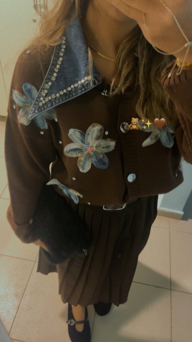 Kahverengi, çiçek desenli, düğmeli, normal uzunlukta, bol kesim, uzun kollu, yakalı denim kadın hırka. Bohem tarzda sokak giyimine uygun.