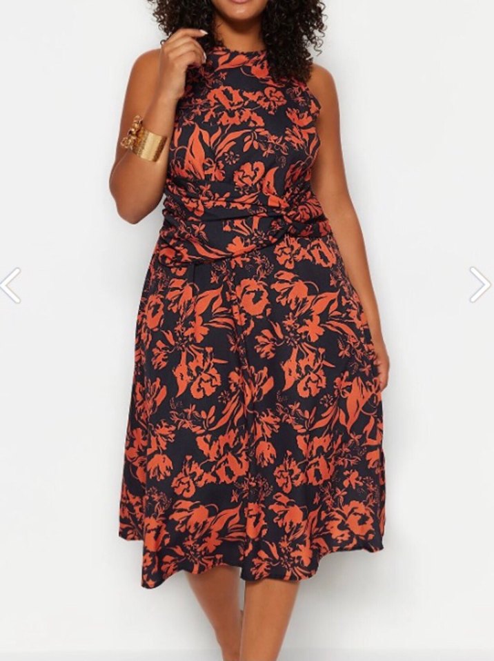 Kahverengi Çiçek Desenli Kemerli Midi Elbise