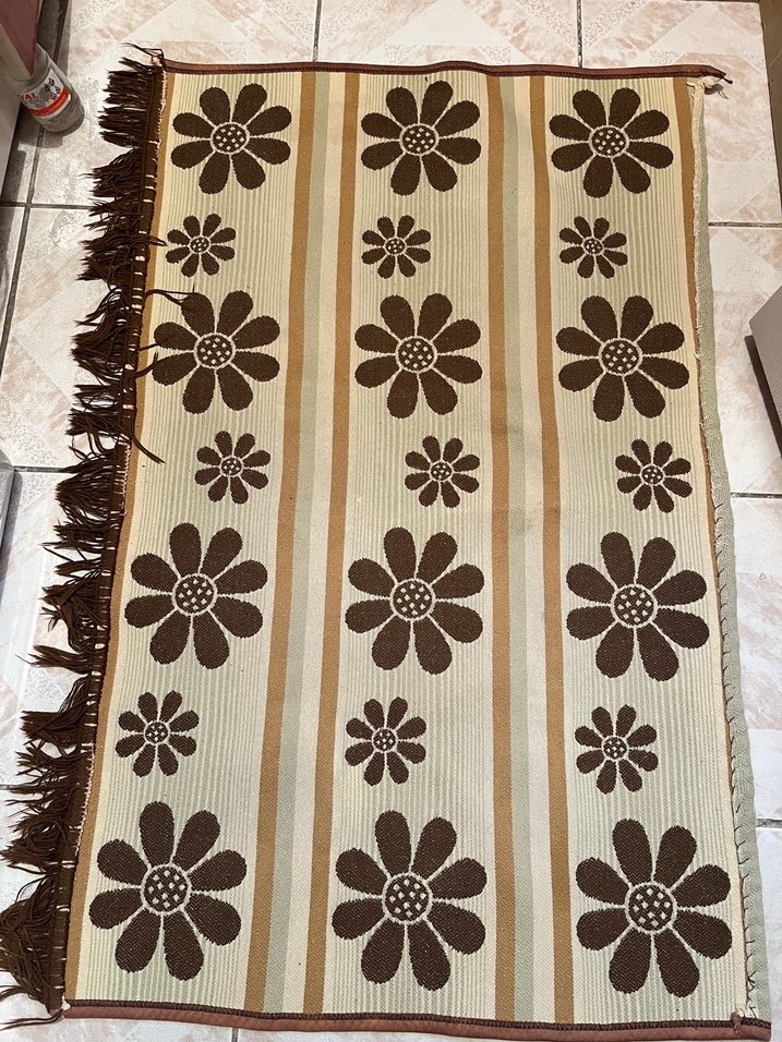 Bej zemin üzerinde koyu kahverengi çiçek desenli, kahverengi çizgili ve püsküllü klasik tarzda halı.