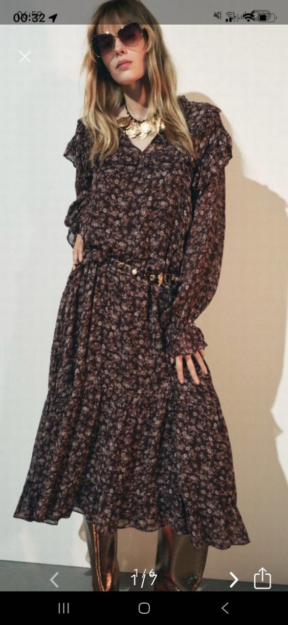 Kahverengi uzun elbise, bol kesim, kemerli, koyu çiçek desenli, V yaka ve askılı kollu, yumuşak sentetik kumaştan yapılmıştır.