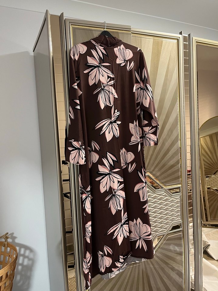 Touche markasına ait, S beden. Kahverengi, uzun, bol kesim, çiçek desenli elbise. Boynunda fular detayı mevcut. Temiz ürün, sıfırdan farksız