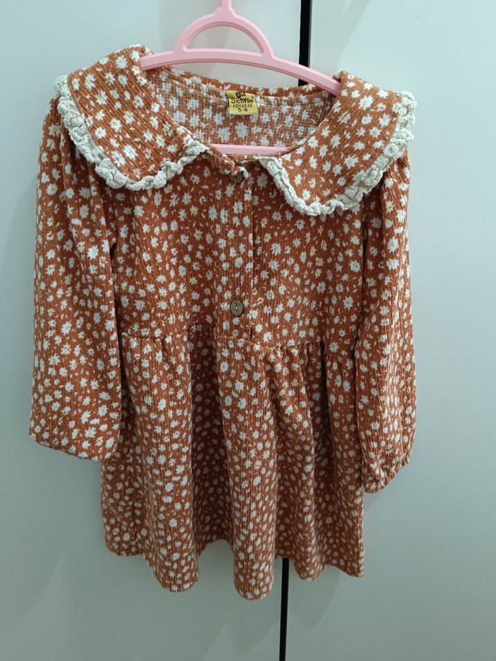 Kahverengi uzun kollu, bol kesim kız elbisesi, yakasında fırfır detay ve pastel çiçek deseniyle bohem tarzı sunar.