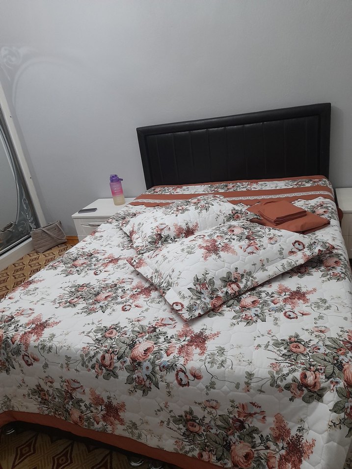 Kahverengi çiçek desenli yatak örtüsü ve uyumlu yastık kılıflarıyla yatak odasına sıcaklık katar. 2 adet yastik kilifi 2 adet kirlent 1 adet lastikli carsaf ve pikesi var takimin icinde kendim kizima diktim ihtiyactan satiyorum adet fiyatidir