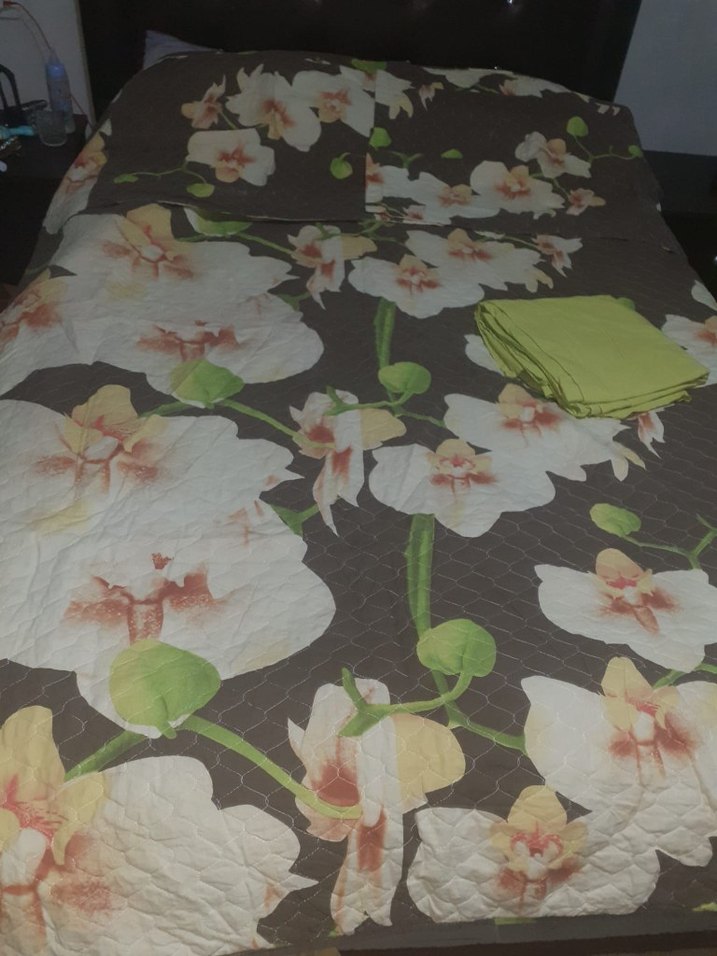 Koyu kahverengi zemin üzerinde büyük çiçek desenleri bulunan yatak örtüsü, yatak odasına doğal bir hava katıyor. ister yatak örtüsü olarak ister içine ince yorgan olur çif kişiliktir çok kullanılmadı marka temsili