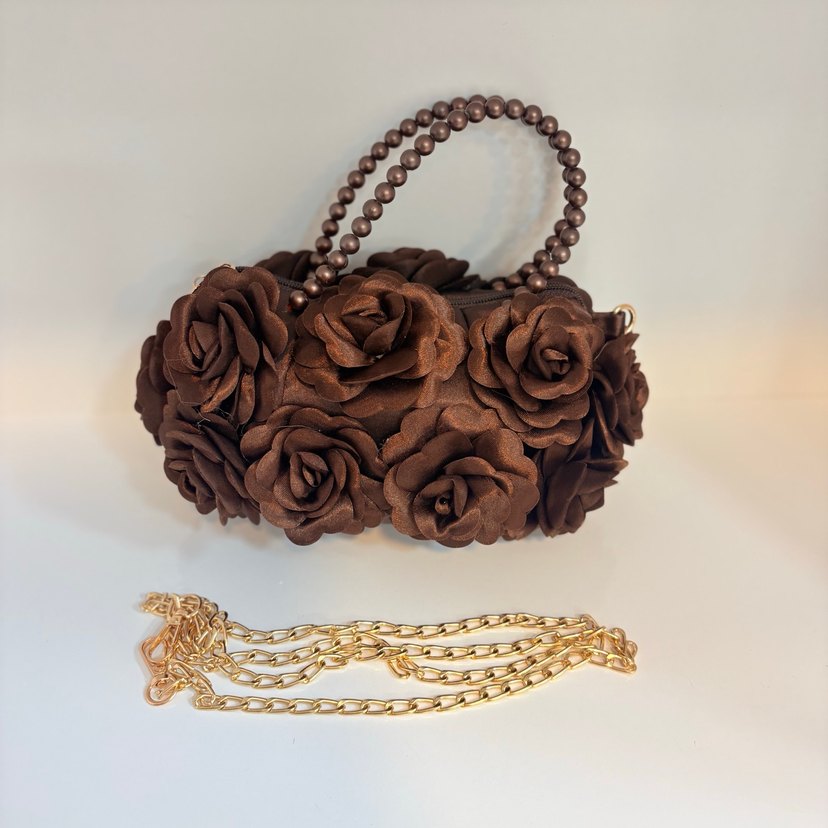 Kahverengi çiçek detayları ve zincir askısı olan, sentetik kumaştan yapılmış bohem tarzda kadın çantası. Düğünler için uygundur.