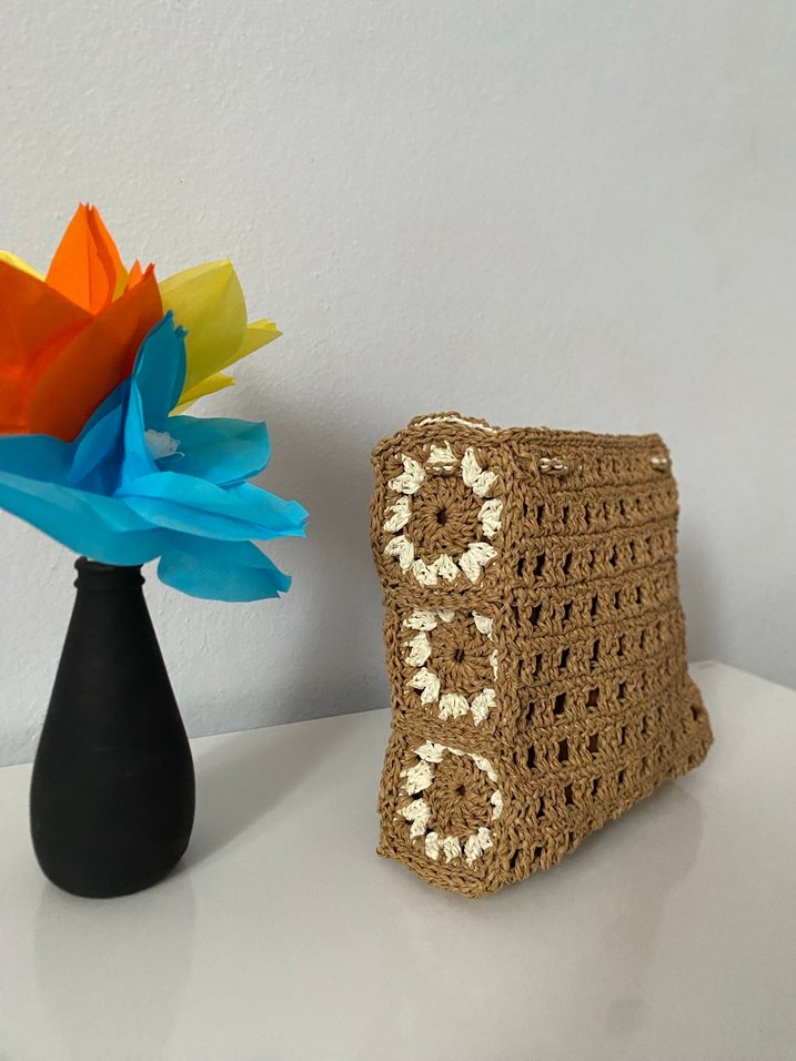 Hafif kahverengi örgü çanta, çiçek desenleri ve dantel detaylarıyla günlük kullanıma uygun bohem tarzda el örgüsü