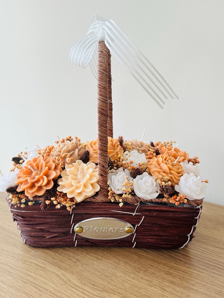 Kahverengi Çiçekli Hasır Sepet kokulu mum buketi