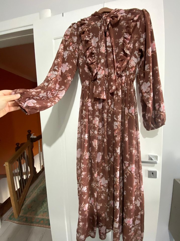 Kahverengi uzun elbise, bol kesim, çiçek desenli, uzun kollu, yüksek yakalı ve fırfır detaylıdır, vintage bohem tarzını yansıtır.