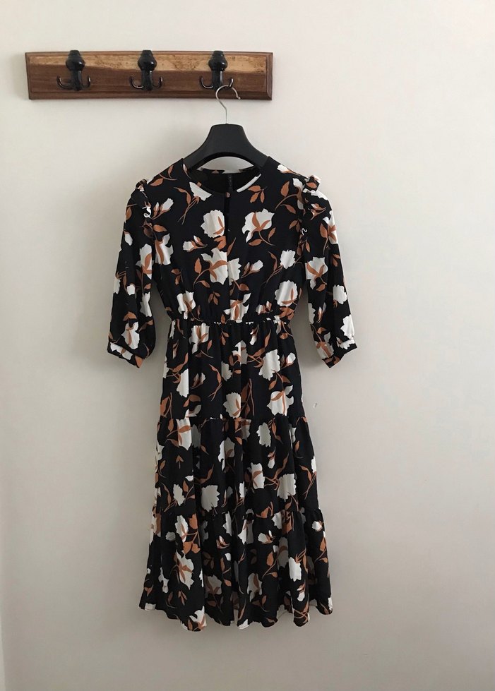 Bir defa giydim. Kahverengi çiçek desenli, kısa kollu, bol kesim uzun elbise. Fırfır detaylı, yuvarlak yaka ve yumuşak sentetik kumaştan yapılmıştır.