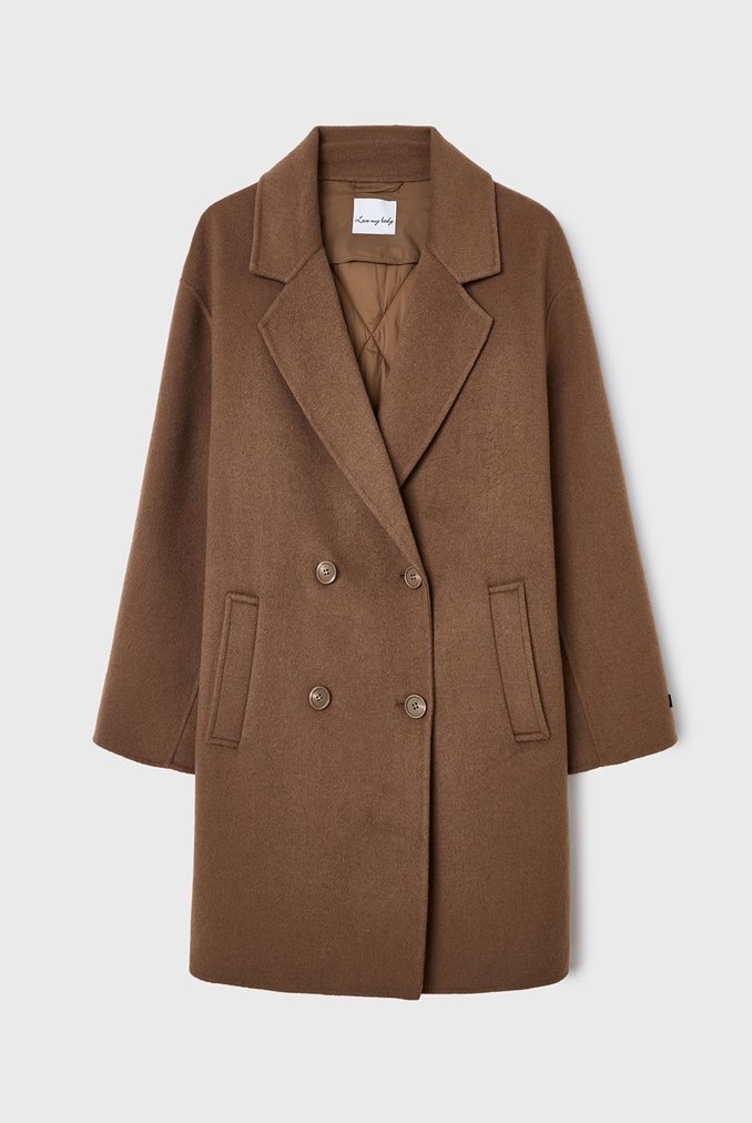Kahverengi, çift düğmeli, klasik yaka ve yan cepli yumuşak ve sıcak kumaştan kaban. Marka temsili çok kaliteli bir kaban