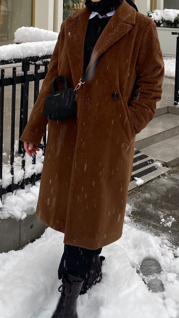 Kahverengi uzun kaban, çift düğmeli tasarıma ve yumuşak, sıcak kumaşa sahiptir. Yan rengi resimdeki gibi renk tonlarında olmadığı için kahverengi seçtim cepleri ve şık kesimiyle soğuk havalar için uygundur. ❄️