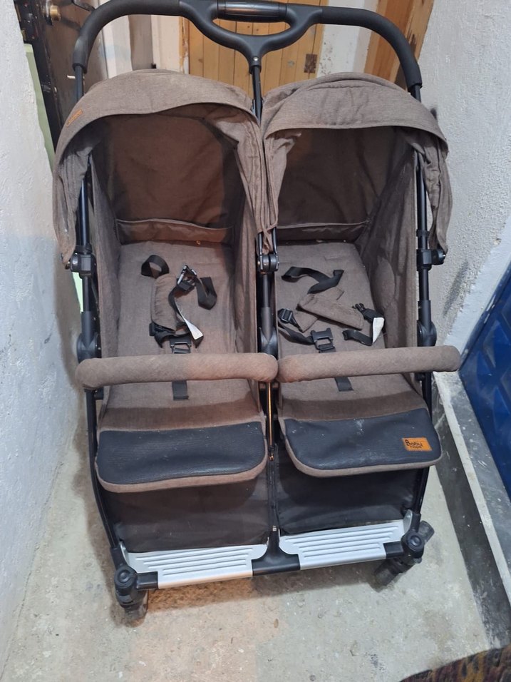 Koyu kahverengi çiftli bebek arabası, emniyet kemerli iki ayrı koltuk ve ayarlanabilir tente ile güneş koruması sağlar. Dayanıklı tutacak ve ayak dayanağı bulunur.