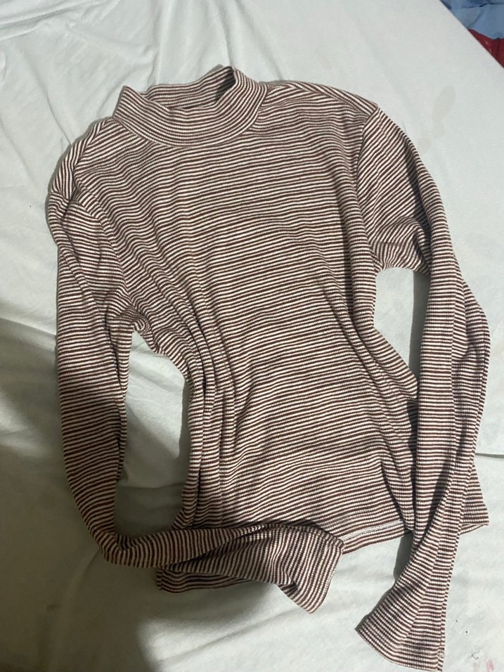 Fitted kesim, uzun kollu, boğazlı kadın kazak. Yumuşak keten kumaştan, kahverengi ve gri çizgili, rahat ve günlük kullanıma uygun.
