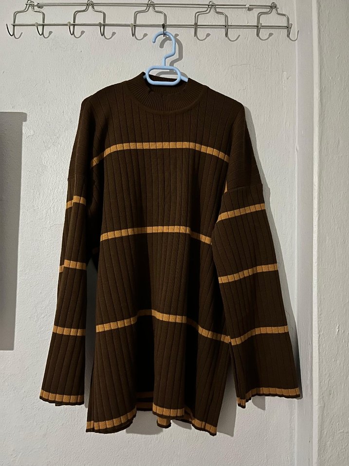 Kahverengi, boğazlı ve uzun kollu örme kazak. Çizgili desene sahip, bol kesim ve midi boyda rahat bir model.