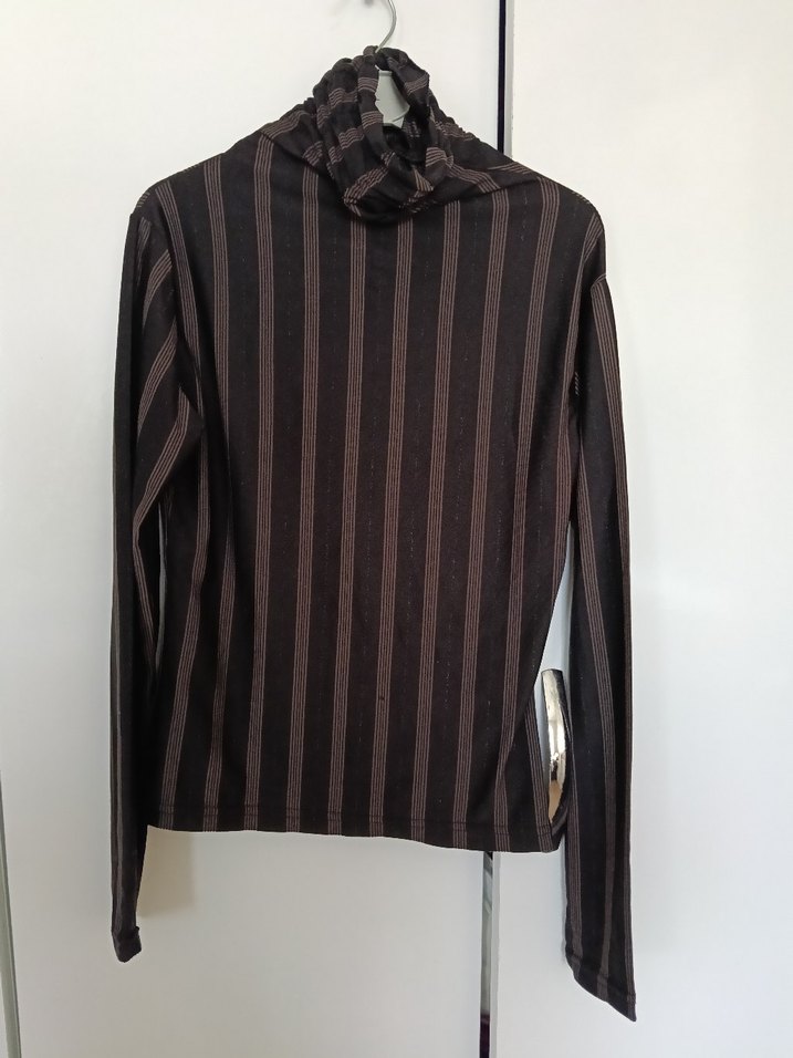 Uzun kollu, boğazlı ve pileli detaylı, kahverengi ve simli çizgili, normal boy midi kadın kazak. Yumuşak sentetik kumaştan, trend günlük stil için uygundur. Ölçüler bel33 koltuk altı 37 uzunluk 49