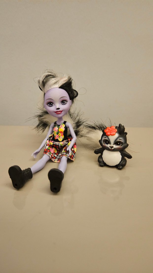 Kahverengi çizgili elbise giymiş, koyu saçlı gri bebek yanında turuncu çiçekli küçük gri hayvan figürü bulunuyor. Detaylı yüz ifadeleri var.